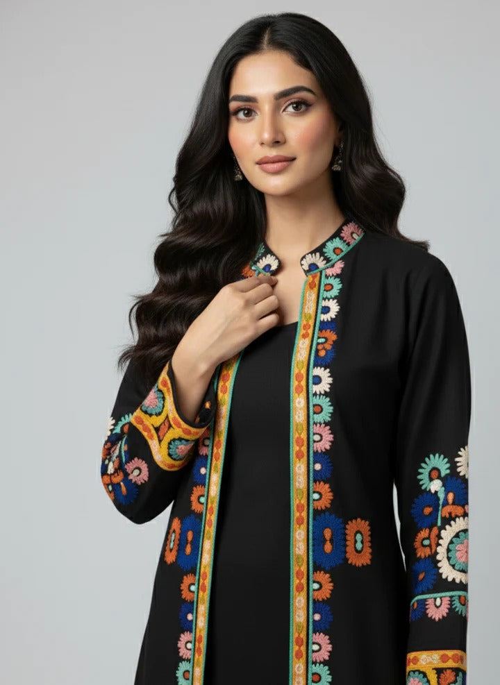 Black Ethnic Print Long Shrug 2-Piece Set (YL 13)
