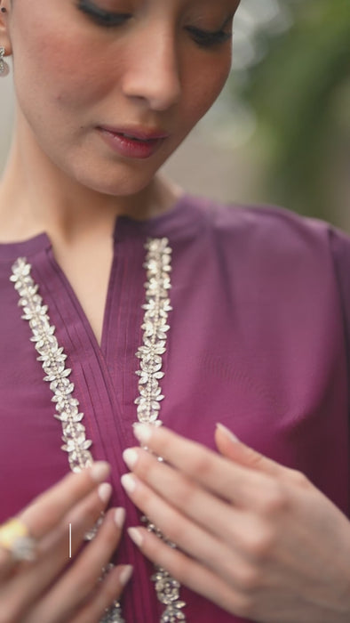 The kurta features subtle embellishment along the neckline, paired with wide-leg trousers for an easy yet polished style — perfect for everyday elegance or semi-formal gatherings.