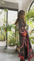 This ensemble features a dramatic and sophisticated long, open-front robe (also known as a Duster or Kimono-style jacket) in a rich, jewel-toned teal (or deep turquoise) fabric. The robe is adorned with a striking, large-scale floral print in warm, contrasting colors like fiery red,...- Rs.3,199.00