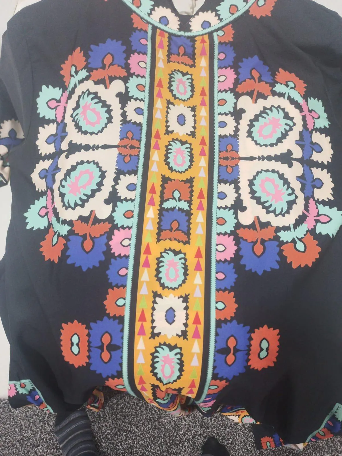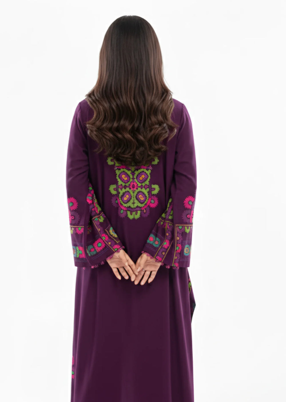 Make a statement in this strikingly designed 2-piece suit. The luxurious, flowing tunic/kameez features an angular, contemporary silhouette with a high band collar. The fabric serves as a perfect canvas for the intricate digital print, which showcases rich, multicolored Mughal or Kashmiri-inspired border and panel patterns.