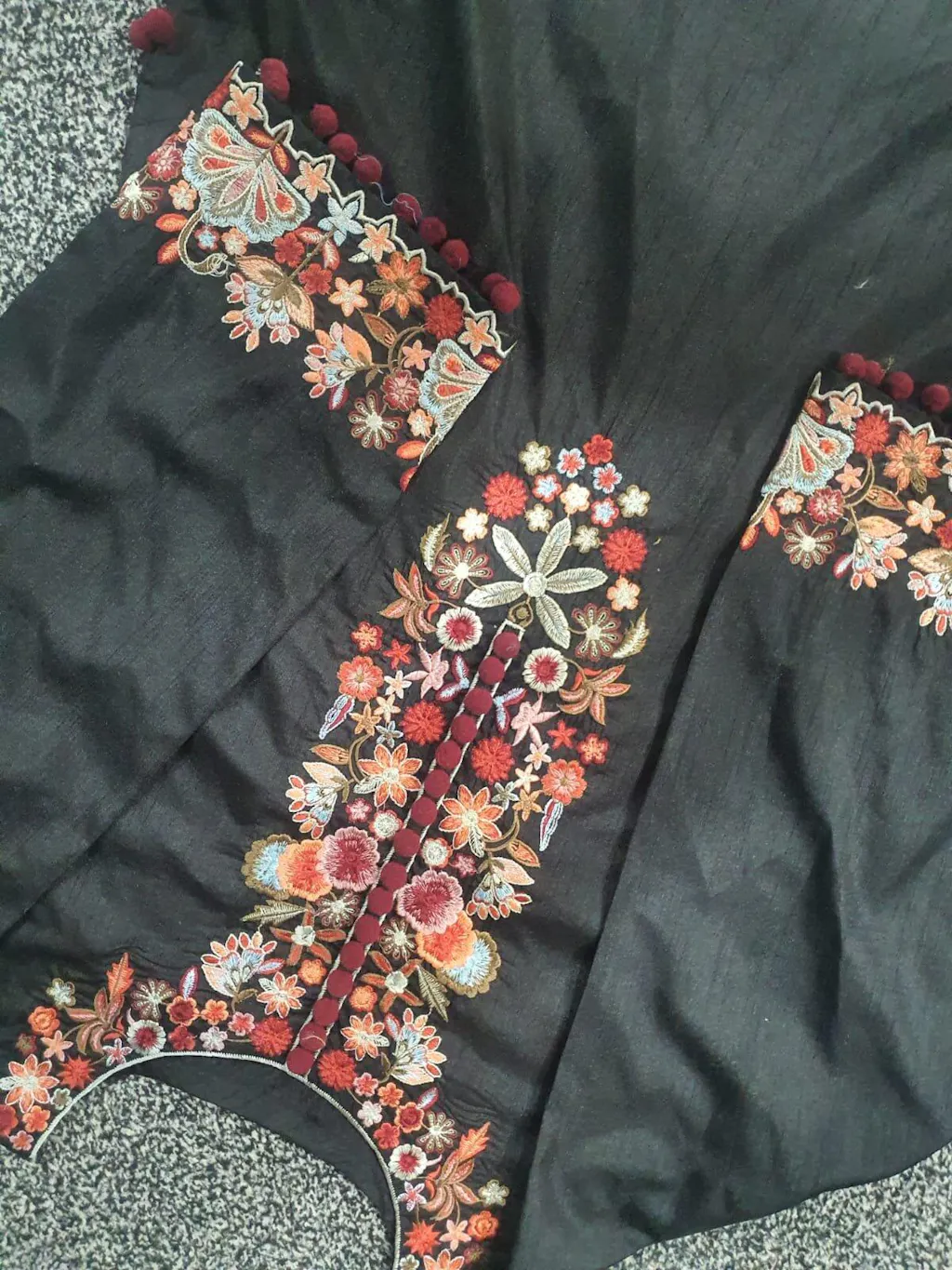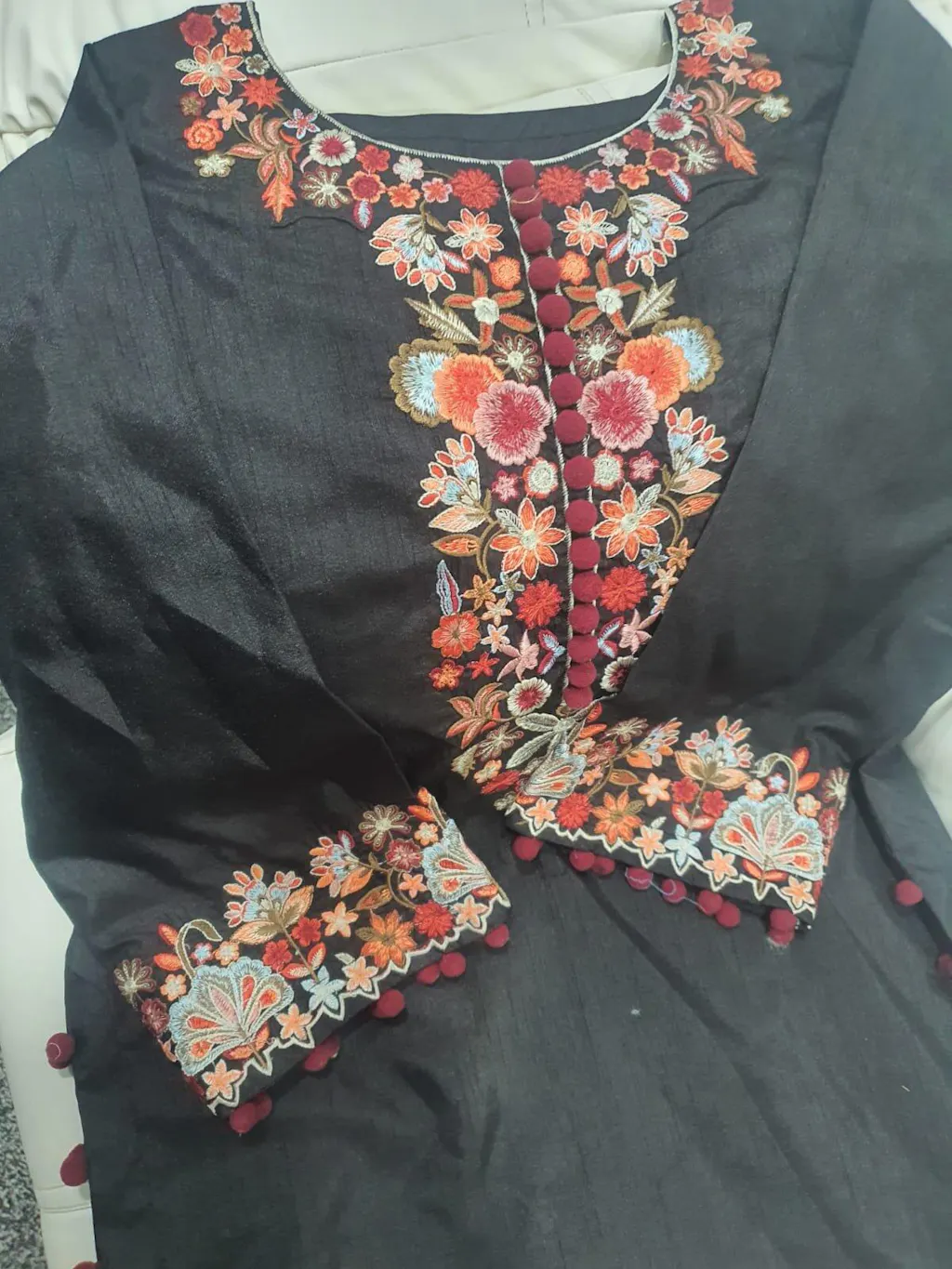 This Black embroidered raw silk 3 pcs, featuring intricate floral detailing in rich tones. Crafted from premium raw silk fabric, this elegant piece blends timeless tradition with modern sophistication, perfect for festive wear and evening gatherings.